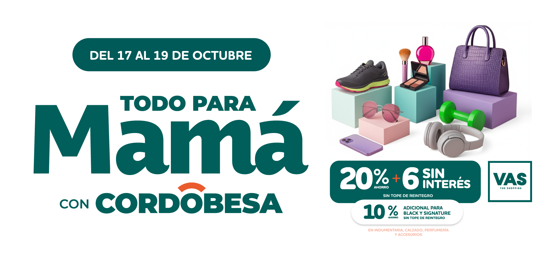 CARTERA DE CONSUMO. PROMOCIÓN VÁLIDA LOS DÍAS 17, 18 Y 19 DE OCTUBRE PARA COMPRAS REALIZADAS CON TARJETA DE CRÉDITO CORDOBESA MASTERCARD Y/O VISA EN LOS DE LOS RUBROS INDUMENTARIA, CALZADO, PERFUMERIA Y ACCESORIOS DE LOS COMERCIOS QUE ESTEN ADHERIDOS A LA PROMOCIÓN. SE APLICARÁ PARA LAS COMPRAS CON TARJETA DE CRÉDITO CORDOBESA (MASTERCARD Y/O VISA) UN 20% DE AHORRO Y SEIS (6) CUOTAS SIN INTERÉS, SIN UN TOPE DE AHORRO POR COMPRA. A SU VEZ, SE APLICARÁ PARA LAS COMPRAS CON TARJETA DE CRÉDITO CORDOBESA BLACK, SIGNATURE Y BANCOR PREMIER UN 10% DE AHORRO ADICIONAL Y SEIS (6) CUOTAS SIN INTERÉS, SIN UN TOPE DE AHORRO POR COMPRA. EL REINTEGRO SE VERÁ REFLEJADO EN HASTA DOS (2) RESÚMENES POSTERIORES A LA FECHA DE REALIZADA LA COMPRA. TASA NOMINAL ANUAL (TNA): 0%. TASA EFECTIVA ANUAL (TEA): 0%. COSTO FINANCIERO TOTAL (CFT) 0%. EJEMPLO: PARA UNA COMPRA DE PESOS CIENTO VEINTE MIL ($120.000) EL CLIENTE ABONARÁ SEIS (6) CUOTAS DE PESOS VEINTE MIL ($20.000) Y TENDRÁ UN REINTEGRO DE PESOS VEINTE MIL ($20.000). EJEMPLO CLIENTES BLACK, SIGNATURE Y BANCOR PREMIER: PARA UNA COMPRA DE PESOS CIENTO VEINTE MIL ($120.000) EL CLIENTE ABONARÁ SEIS (6) CUOTAS DE PESOS VEINTE MIL ($20.000) Y TENDRÁ UN REINTEGRO DE PESOS TREINTA Y SEIS MIL ($36.000). NO ACUMULABLE CON OTRAS PROMOCIONES. NO APLICA A PAGOS A TRAVÉS DE BILLETERAS VIRTUALES (EXCEPTO MODO), PLATAFORMAS DE PAGO Y/O PORTALES DE PAGOS ON-LINE AJENOS A LOS COMERCIOS. NO APLICA PARA PAGO ELECTRÓNICO INMEDIATO (PEI), NI PAGOS CON QR CON DÉBITO EN CUENTA BANCARIA. EL BENEFICIO SE APLICARÁ SIEMPRE QUE LA TARJETA SE ENCUENTRE HABILITADA Y LA CUENTA NO SE ENCUENTRE EN MORA Y/O BLOQUEADA POR MOTIVOS ADMINISTRATIVOS. BANCO PROVINCIA DE CÓRDOBA S.A. CUIT 30999228565 – DOMICILIO: SAN JERÓNIMO 166, CÓRDOBA.